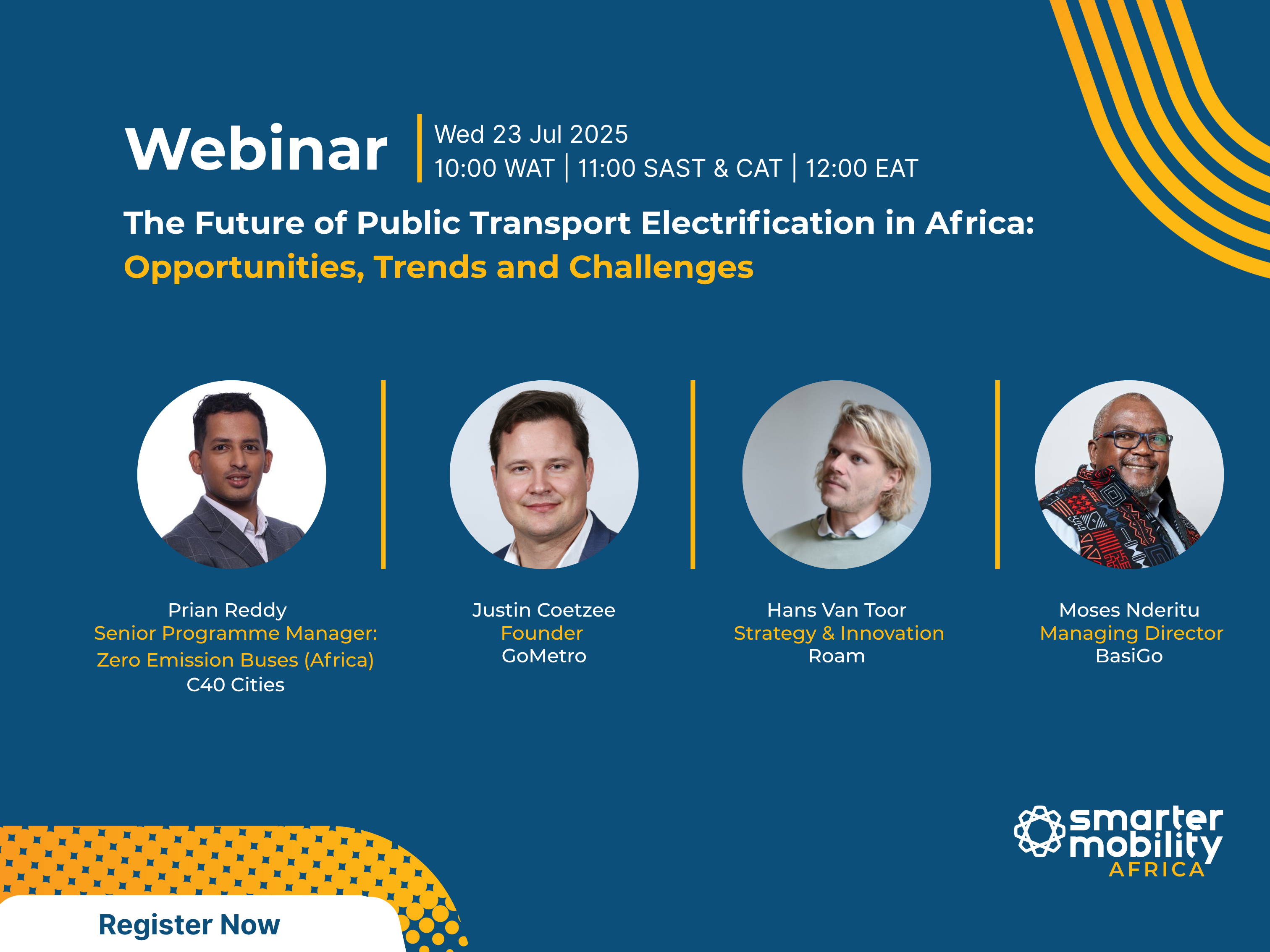 - Speakers of the upcoming webinar “The Future of Public Transport Electrification in Africa” include experts from C40 Cities, GoMetro, Roam, and BasiGo — driving the conversation on electric mobility across the continent